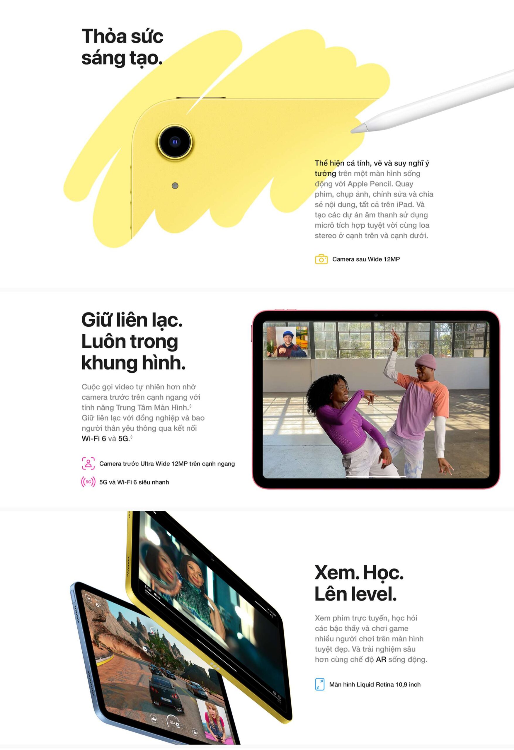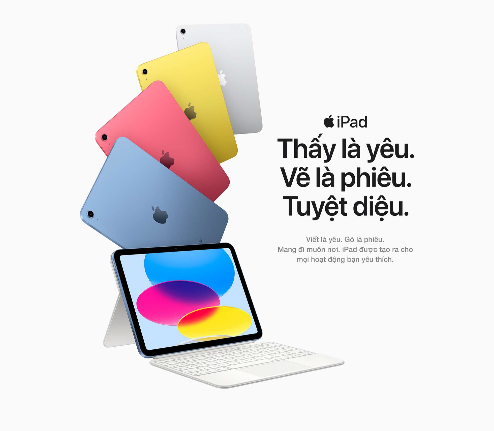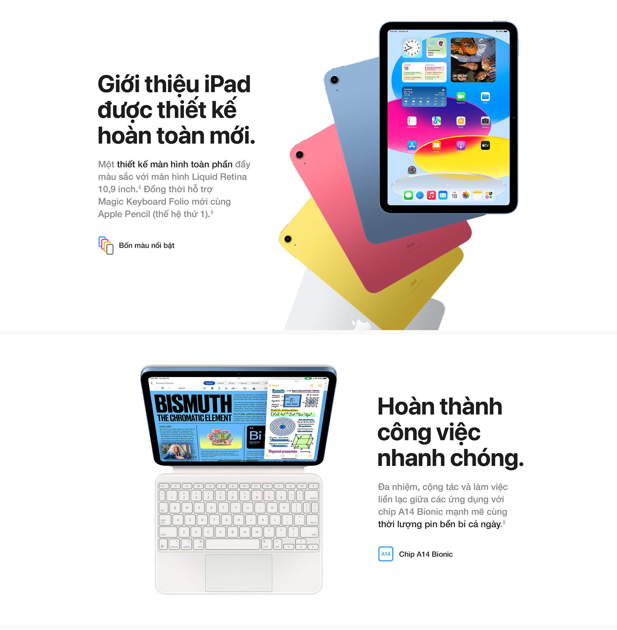Được thiết kế lại đầy sắc màu và đa năng hơn bao giờ hết. Với thiết kế toàn màn hình, màn hình Liquid Retina 10.9 inch1 và bốn màu lộng lẫy. iPad đem lại một phương thức mạnh mẽ để sáng tạo, duy trì kết nối và hoàn tất mọi việc.