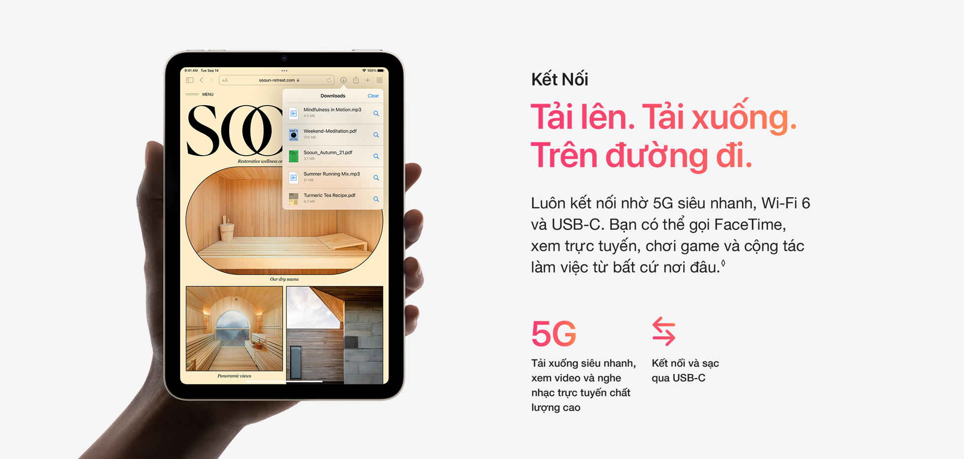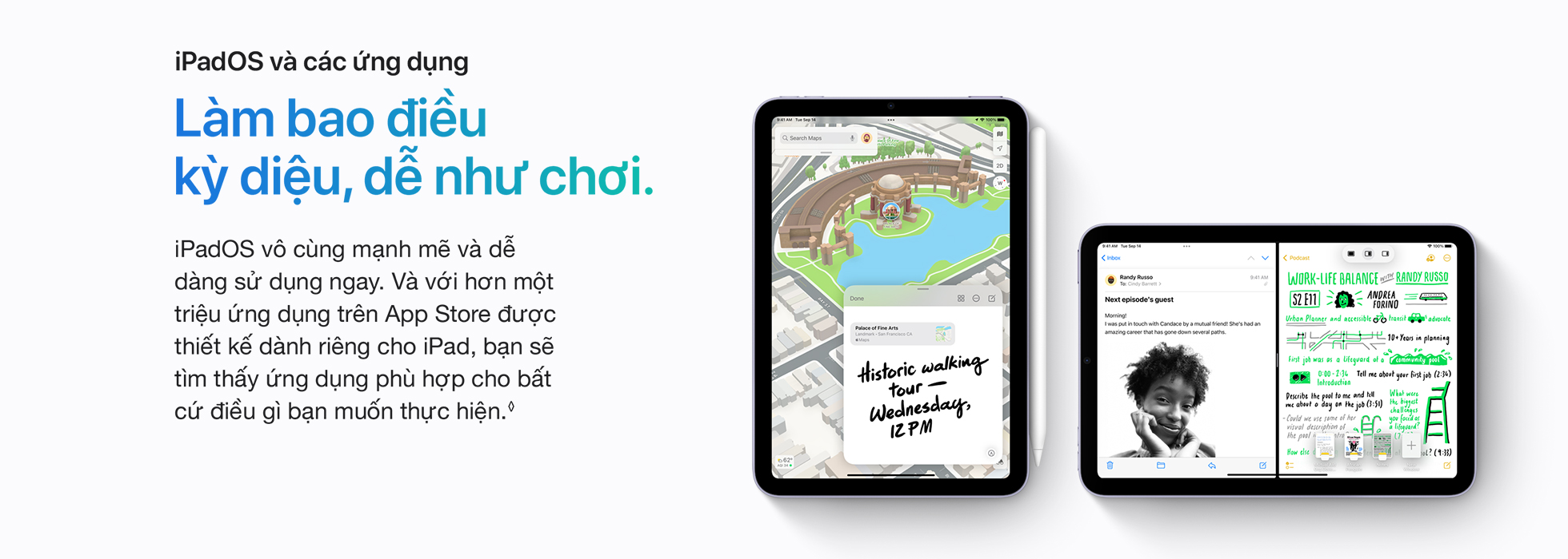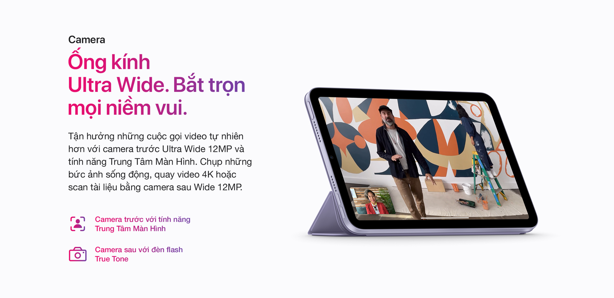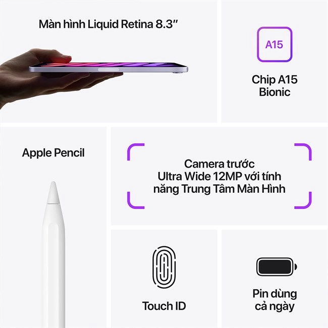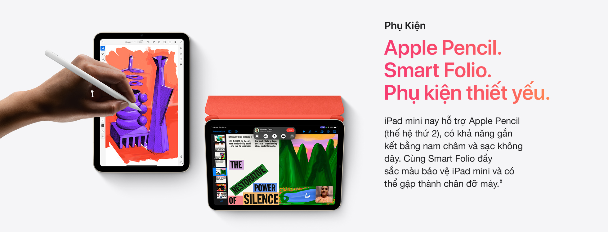 iPad mini mới. Thiết kế màn hình toàn phần với màn hình Liquid Retina 8.3 inch.1 Chip A15 Bionic mạnh mẽ với Neural Engine. Camera trước Ultra Wide 12MP với tính năng Trung Tâm Màn Hình. Cổng kết nối USB-C. Mạng 5G siêu nhanh.2 Ghi chú, đánh dấu tài liệu hoặc phác thảo ngay khi những ý tưởng lớn xuất hiện trong đầu với Apple Pencil (thế hệ thứ 2) có khả năng gắn kết bằng nam châm và sạc không dây.3