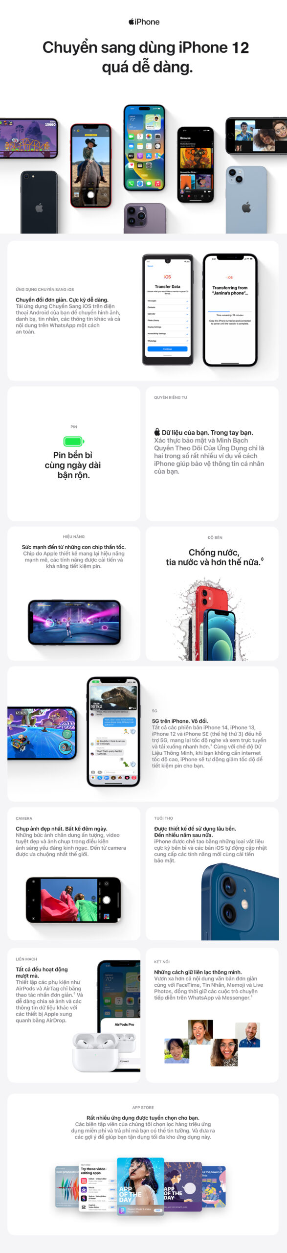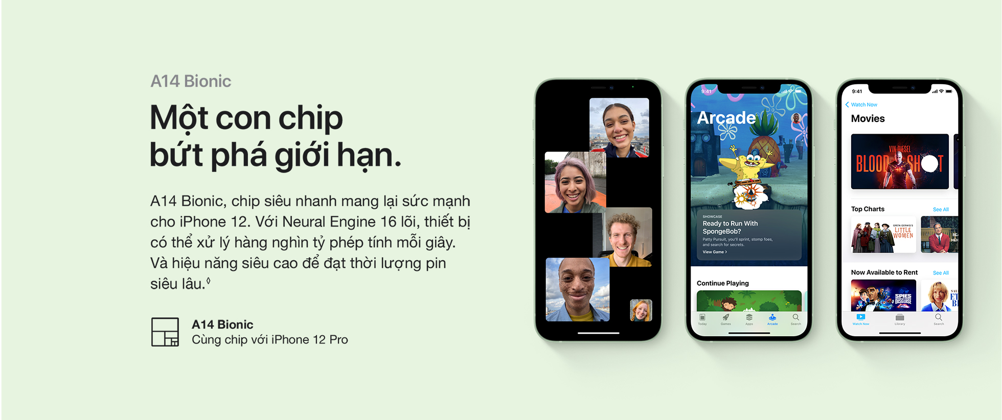 iPhone 12. Mạng 5G giúp tải xuống các bộ phim một cách nhanh chóng và xem trực tuyến video chất lượng cao.1 Màn hình Super Retina XDR 6.1 inch sáng đẹp ấn tượng.2 Ceramic Shield với khả năng chịu va đập khi rơi tốt hơn gấp 4 lần.3 Ảnh chụp tuyệt đẹp trong điều kiện ánh sáng yếu với chế độ Ban Đêm ở tất cả các camera. Quay phim, biên tập và phát video Dolby Vision đẳng cấp điện ảnh. Chip A14 Bionic mạnh mẽ. Hãy để điều thú vị bắt đầu.